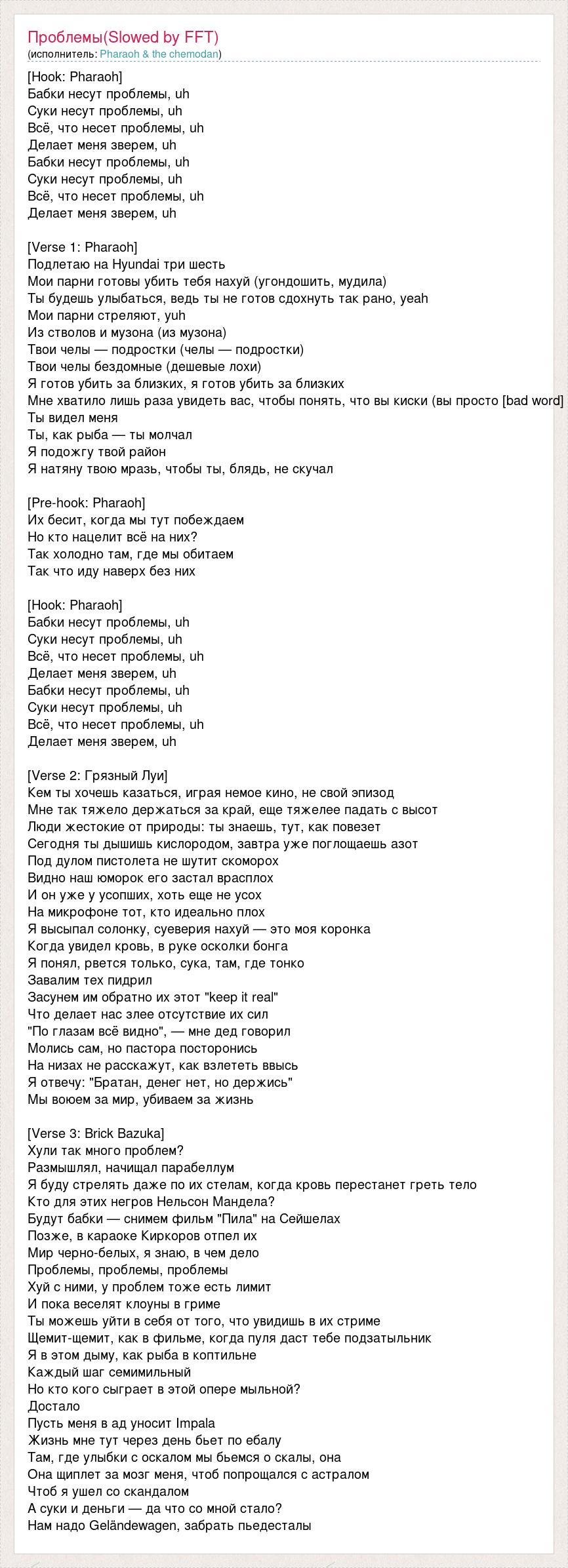 [Hook: Pharaoh] Бабки несут проблемы, uh Суки несут проблемы, uh Всё, что несет проблемы, uh Делает меня зверем, uh Бабки несут проблемы, uh Суки несут проблемы, uh Всё, что несет проблемы, uh Делает меня зверем, uh [Verse 1: Pharaoh] Подлетаю на Hyundai три шесть Мои парни готовы убить тебя нахуй (угондошить, мудила) Ты будешь улыбаться, ведь ты не готов сдохнуть так рано, yeah Мои парни стреляют, yuh Из стволов и музона (из музона) Твои челы — подростки (челы — подростки) Твои челы бездомные (дешевые лохи) Я готов убить за близких, я готов убить за близких Мне хватило лишь раза увидеть вас, чтобы понять, что вы киски (вы просто [bad word] Ты видел меня Ты, как рыба — ты молчал Я подожгу твой район Я натяну твою мразь, чтобы ты, блядь, не скучал [Pre-hook: Pharaoh] Их бесит, когда мы тут побеждаем Но кто нацелит всё на них? Так холодно там, где мы обитаем Так что иду наверх без них [Hook: Pharaoh] Бабки несут проблемы, uh Суки несут проблемы, uh Всё, что несет проблемы, uh Делает меня зверем, uh Бабки несут проблемы, uh Суки несут проблемы, uh Всё, что несет проблемы, uh Делает меня зверем, uh [Verse 2: Грязный Луи] Кем ты хочешь казаться, играя немое кино, не свой эпизод Мне так тяжело держаться за край, еще тяжелее падать с высот Люди жестокие от природы: ты знаешь, тут, как повезет Сегодня ты дышишь кислородом, завтра уже поглощаешь азот Под дулом пистолета не шутит скоморох Видно наш юморок его застал врасплох И он уже у усопших, хоть еще не усох На микрофоне тот, кто идеально плох Я высыпал солонку, суеверия нахуй — это моя коронка Когда увидел кровь, в руке осколки бонга Я понял, рвется только, сука, там, где тонко Завалим тех пидрил Засунем им обратно их этот "keep it real" Что делает нас злее отсутствие их сил "По глазам всё видно", — мне дед говорил Молись сам, но пастора посторонись На низах не расскажут, как взлететь ввысь Я отвечу: "Братан, денег нет, но держись" Мы воюем за мир, убиваем за жизнь [Verse 3: Brick Bazuka] Хули так много проблем? Размышлял, начищал парабеллум Я буду стрелять даже по их стелам, когда кровь перестанет греть тело Кто для этих негров Нельсон Мандела? Будут бабки — снимем фильм "Пила" на Сейшелах Позже, в караоке Киркоров отпел их Мир черно-белых, я знаю, в чем дело Проблемы, проблемы, проблемы Хуй с ними, у проблем тоже есть лимит И пока веселят клоуны в гриме Ты можешь уйти в себя от того, что увидишь в их стриме Щемит-щемит, как в фильме, когда пуля даст тебе подзатыльник Я в этом дыму, как рыба в коптильне Каждый шаг семимильный Но кто кого сыграет в этой опере мыльной? Достало Пусть меня в ад уносит Impala Жизнь мне тут через день бьет по ебалу Там, где улыбки с оскалом мы бьемся о скалы, она Она щиплет за мозг меня, чтоб попрощался с астралом Чтоб я ушел со скандалом А суки и деньги — да что со мной стало? Нам надо Geländewagen, забрать пьедесталы