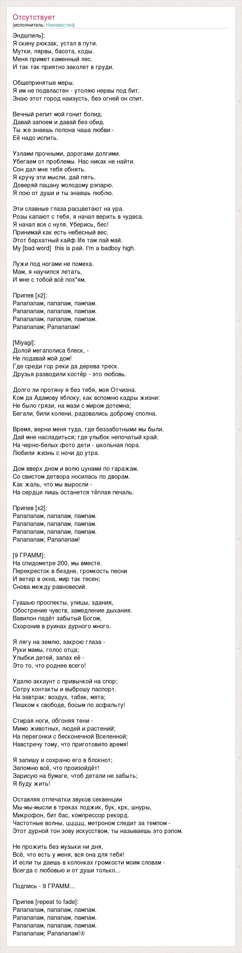 Эндшпиль]: Я скину рюкзак, устал в пути. Мутки, лярвы, басота, коды. Меня примет каменный лес. И так так приятно заколет в груди. Общепринятые меры. Я им не подвластен - утоляю нервы под бит. Знаю этот город наизусть, без огней он спит. Вечный репит мой гонит болид. Давай запоем и давай без обид. Ты же знаешь полона чаша любви - Её надо испить. Узлами прочными, дорогами долгими. Убегаем от проблемы. Нас никак не найти. Сон дал мне тебя обнять. Я кручу эти мысли, дай пять. Доверяй пацану молодому рэпарю. Я пою от души и ты знаешь люблю. Эти славные глаза расцветают на ура. Розы капают с тебя, я начал верить в чудеса. Я начал все с нуля. Уберись, бес! Принимай как есть небесный вес. Этот бархатный кайф life там лай май. My [bad word] this is рай. I'm a badboy high. Лужи под ногами не помеха. Мам, я научился летать, И мне с тобой всё пох*ям. Припев [x2]: Рапапапам, папапам, пампам. Рапапапам, папапам, пампам. Рапапапам, папапам, пампам. Рапапапам; Рапапапам! [Miyagi]: Долой мегаполиса блеск, - Не подавай мой дом! Где среди гор реки да дерева треск. Друзья разводили костёр - это любовь. Долго ли протяну я без тебя, моя Отчизна. Ком да Адамову яблоку, как вспомню кадры жизни: Не было грязи, на мази с миром дотемна; Бегали, били колени, радовались доброму сполна. Время, верни меня туда, где беззаботными мы были. Дай мне насладиться; где улыбок непочатый край. На черно-белых фото дети - школьная пора. Любили жизнь с ночи до утра. Дом вверх дном и волю цунами по гаражам. Со свистом детвора носилась по дворам. Как жаль, что мы выросли - На сердце лишь останется тёплая печаль. Припев [x2]: Рапапапам, папапам, пампам. Рапапапам, папапам, пампам. Рапапапам, папапам, пампам. Рапапапам; Рапапапам! [9 ГРАММ]: На спидометре 200, мы вместе. Перекресток в бездне, громкость песни И ветер в окна, мир так тесен; Снова между равновесий. Гуашью проспекты, улицы, здания, Обострение чувств, замедление дыхания. Вавилон падёт забытый Богом, Схоронив в руинах дурного много. Я лягу на землю, закрою глаза - Руки мамы, голос отца; Улыбки детей, запах её - Это то, что роднее всего! Удалю аккаунт с привычкой на спор; Сотру контакты и выброшу паспорт. На завтрак: воздух, табак, мята; Пешком к свободе, босым по асфальту! Стирая ноги, обгоняя тени - Мимо животных, людей и растений; На перегонки с бесконечной Вселенной; Навстречу тому, что приготовило время! Я запишу и сохраню его в блокнот; Запомню всё, что произойдёт! Зарисую на бумаге, чтоб детали не забыть; Я буду жить! Оставляя отпечатки звуков секвенции Мы-мы-мысли в треках лоджик, бук, крк, шнуры, Микрофон, бит бас, компрессор рекорд. Частотные волны, ццццц, метроном следит за темпом - Этот дурной тон зову искусством, ты называешь это рэпом. Не прожить без музыки ни дня, Всё, что есть у меня, вся она для тебя! И если ты даешь в колонках громкости моим словам - Всегда с любовью и от души только... Подпись - 9 ГРАММ... Припев [repeat to fade]: Рапапапам, папапам, пампам. Рапапапам, папапам, пампам. Рапапапам, папапам, пампам. Рапапапам; Рапапапам!♔
