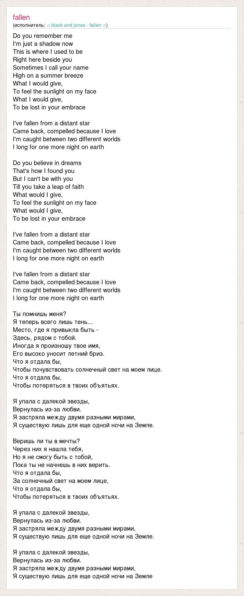 Do you remember me I'm just a shadow now This is where I used to be Right here beside you Sometimes I call your name High on a summer breeze What I would give, To feel the sunlight on my face What I would give, To be lost in your embrace I've fallen from a distant star Came back, compelled because I love I'm caught between two different worlds I long for one more night on earth Do you believe in dreams That's how I found you But I can't be with you Till you take a leap of faith What would I give, To feel the sunlight on my face What would I give, To be lost in your embrace I've fallen from a distant star Came back, compelled because I love I'm caught between two different worlds I long for one more night on earth I've fallen from a distant star Came back, compelled because I love I'm caught between two different worlds I long for one more night on earth Ты помнишь меня? Я теперь всего лишь тень... Место, где я привыкла быть - Здесь, рядом с тобой. Иногда я произношу твое имя, Его высоко уносит летний бриз. Что я отдала бы, Чтобы почувствовать солнечный свет на моем лице. Что я отдала бы, Чтобы потеряться в твоих объятьях. Я упала с далекой звезды, Вернулась из-за любви. Я застряла между двумя разными мирами, Я существую лишь для еще одной ночи на Земле. Веришь ли ты в мечты? Через них я нашла тебя, Но я не смогу быть с тобой, Пока ты не начнешь в них верить. Что я отдала бы, За солнечный свет на моем лице, Что я отдала бы, Чтобы потеряться в твоих объятьях. Я упала с далекой звезды, Вернулась из-за любви. Я застряла между двумя разными мирами, Я существую лишь для еще одной ночи на Земле. Я упала с далекой звезды, Вернулась из-за любви. Я застряла между двумя разными мирами, Я существую лишь для еще одной ночи на Земле