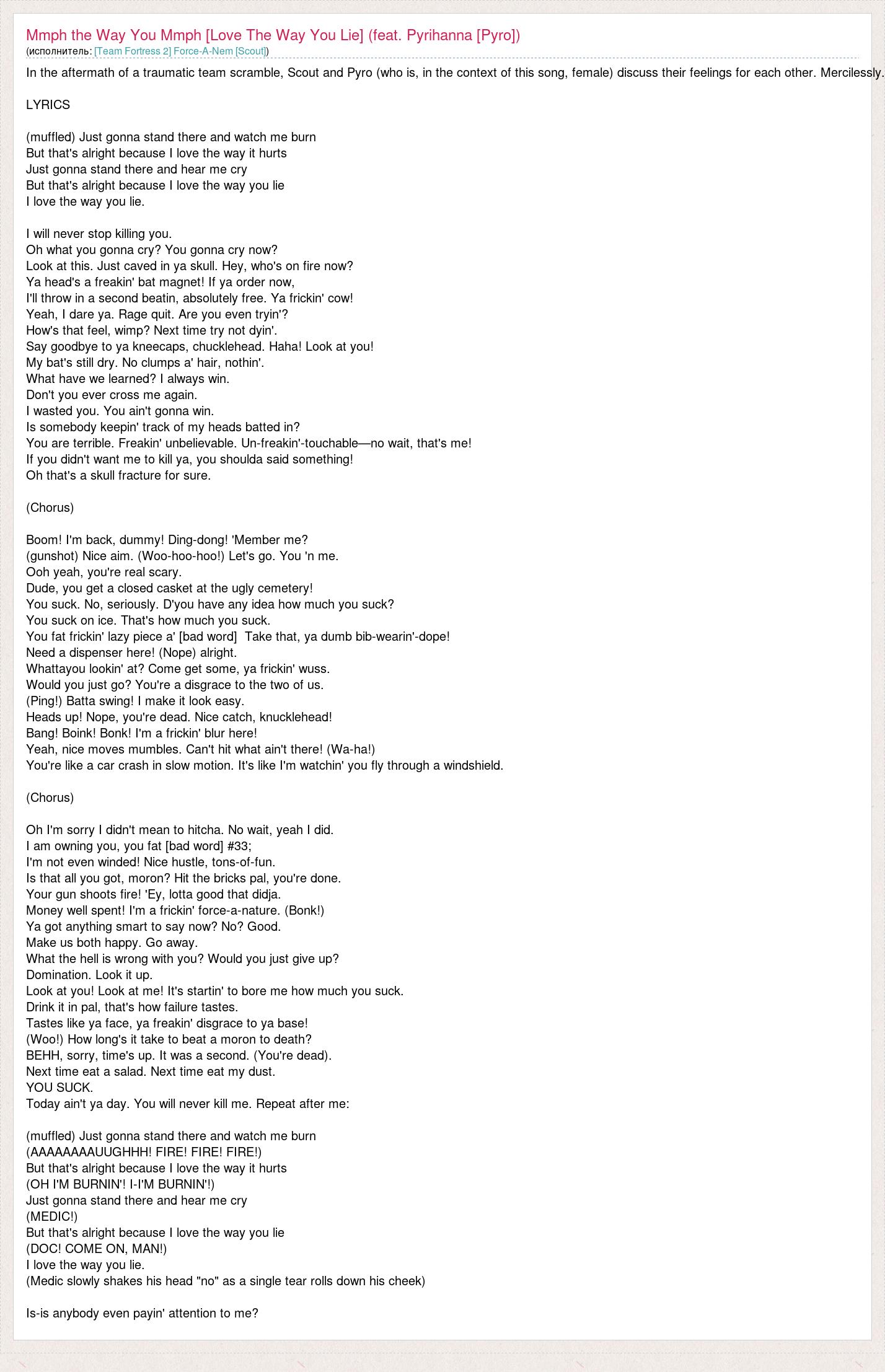 In the aftermath of a traumatic team scramble, Scout and Pyro (who is, in the context of this song, female) discuss their feelings for each other. Mercilessly. LYRICS (muffled) Just gonna stand there and watch me burn But that's alright because I love the way it hurts Just gonna stand there and hear me cry But that's alright because I love the way you lie I love the way you lie. I will never stop killing you. Oh what you gonna cry? You gonna cry now? Look at this. Just caved in ya skull. Hey, who's on fire now? Ya head's a freakin' bat magnet! If ya order now, I'll throw in a second beatin, absolutely free. Ya frickin' cow! Yeah, I dare ya. Rage quit. Are you even tryin'? How's that feel, wimp? Next time try not dyin'. Say goodbye to ya kneecaps, chucklehead. Haha! Look at you! My bat's still dry. No clumps a' hair, nothin'. What have we learned? I always win. Don't you ever cross me again. I wasted you. You ain't gonna win. Is somebody keepin' track of my heads batted in? You are terrible. Freakin' unbelievable. Un-freakin'-touchable—no wait, that's me! If you didn't want me to kill ya, you shoulda said something! Oh that's a skull fracture for sure. (Chorus) Boom! I'm back, dummy! Ding-dong! 'Member me? (gunshot) Nice aim. (Woo-hoo-hoo!) Let's go. You 'n me. Ooh yeah, you're real scary. Dude, you get a closed casket at the ugly cemetery! You suck. No, seriously. D'you have any idea how much you suck? You suck on ice. That's how much you suck. You fat frickin' lazy piece a' [bad word] Take that, ya dumb bib-wearin'-dope! Need a dispenser here! (Nope) alright. Whattayou lookin' at? Come get some, ya frickin' wuss. Would you just go? You're a disgrace to the two of us. (Ping!) Batta swing! I make it look easy. Heads up! Nope, you're dead. Nice catch, knucklehead! Bang! Boink! Bonk! I'm a frickin' blur here! Yeah, nice moves mumbles. Can't hit what ain't there! (Wa-ha!) You're like a car crash in slow motion. It's like I'm watchin' you fly through a windshield. (Chorus) Oh I'm sorry I didn't mean to hitcha. No wait, yeah I did. I am owning you, you fat [bad word] #33; I'm not even winded! Nice hustle, tons-of-fun. Is that all you got, moron? Hit the bricks pal, you're done. Your gun shoots fire! 'Ey, lotta good that didja. Money well spent! I'm a frickin' force-a-nature. (Bonk!) Ya got anything smart to say now? No? Good. Make us both happy. Go away. What the hell is wrong with you? Would you just give up? Domination. Look it up. Look at you! Look at me! It's startin' to bore me how much you suck. Drink it in pal, that's how failure tastes. Tastes like ya face, ya freakin' disgrace to ya base! (Woo!) How long's it take to beat a moron to death? BEHH, sorry, time's up. It was a second. (You're dead). Next time eat a salad. Next time eat my dust. YOU SUCK. Today ain't ya day. You will never kill me. Repeat after me: (muffled) Just gonna stand there and watch me burn (AAAAAAAAUUGHHH! FIRE! FIRE! FIRE!) But that's alright because I love the way it hurts (OH I'M BURNIN'! I-I'M BURNIN'!) Just gonna stand there and hear me cry (MEDIC!) But that's alright because I love the way you lie (DOC! COME ON, MAN!) I love the way you lie. (Medic slowly shakes his head "no" as a single tear rolls down his cheek) Is-is anybody even payin' attention to me?