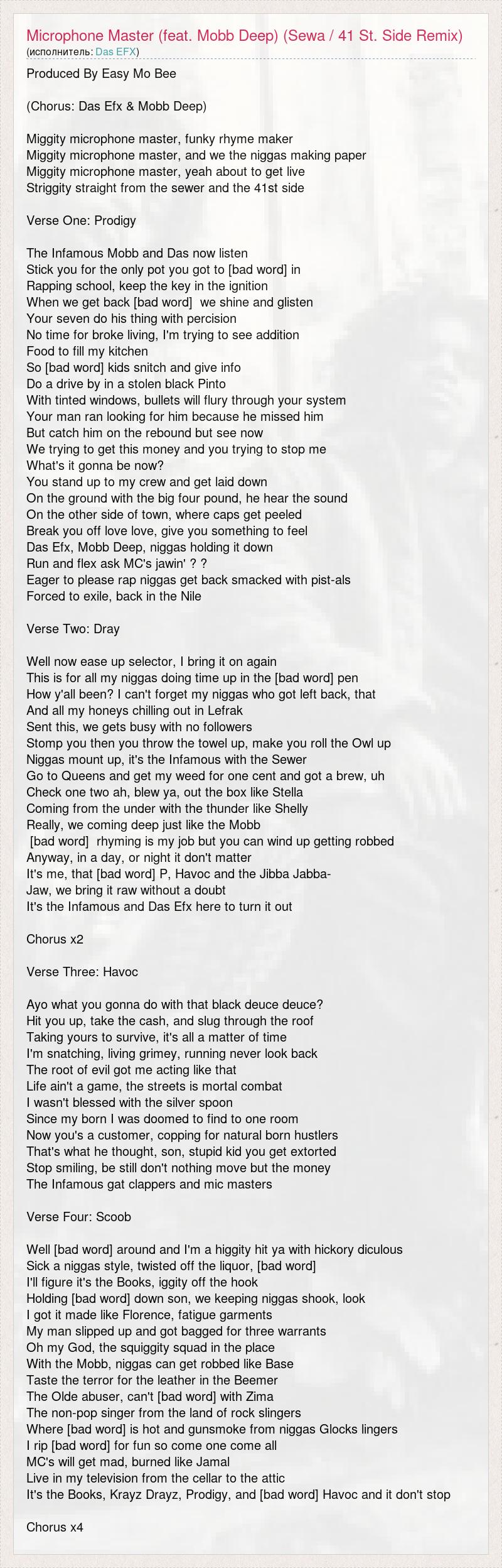Produced By Easy Mo Bee (Chorus: Das Efx & Mobb Deep) Miggity microphone master, funky rhyme maker Miggity microphone master, and we the niggas making paper Miggity microphone master, yeah about to get live Striggity straight from the sewer and the 41st side Verse One: Prodigy The Infamous Mobb and Das now listen Stick you for the only pot you got to [bad word] in Rapping school, keep the key in the ignition When we get back [bad word] we shine and glisten Your seven do his thing with percision No time for broke living, I'm trying to see addition Food to fill my kitchen So [bad word] kids snitch and give info Do a drive by in a stolen black Pinto With tinted windows, bullets will flury through your system Your man ran looking for him because he missed him But catch him on the rebound but see now We trying to get this money and you trying to stop me What's it gonna be now? You stand up to my crew and get laid down On the ground with the big four pound, he hear the sound On the other side of town, where caps get peeled Break you off love love, give you something to feel Das Efx, Mobb Deep, niggas holding it down Run and flex ask MC's jawin' ? ? Eager to please rap niggas get back smacked with pist-als Forced to exile, back in the Nile Verse Two: Dray Well now ease up selector, I bring it on again This is for all my niggas doing time up in the [bad word] pen How y'all been? I can't forget my niggas who got left back, that And all my honeys chilling out in Lefrak Sent this, we gets busy with no followers Stomp you then you throw the towel up, make you roll the Owl up Niggas mount up, it's the Infamous with the Sewer Go to Queens and get my weed for one cent and got a brew, uh Check one two ah, blew ya, out the box like Stella Coming from the under with the thunder like Shelly Really, we coming deep just like the Mobb [bad word] rhyming is my job but you can wind up getting robbed Anyway, in a day, or night it don't matter It's me, that [bad word] P, Havoc and the Jibba Jabba- Jaw, we bring it raw without a doubt It's the Infamous and Das Efx here to turn it out Chorus x2 Verse Three: Havoc Ayo what you gonna do with that black deuce deuce? Hit you up, take the cash, and slug through the roof Taking yours to survive, it's all a matter of time I'm snatching, living grimey, running never look back The root of evil got me acting like that Life ain't a game, the streets is mortal combat I wasn't blessed with the silver spoon Since my born I was doomed to find to one room Now you's a customer, copping for natural born hustlers That's what he thought, son, stupid kid you get extorted Stop smiling, be still don't nothing move but the money The Infamous gat clappers and mic masters Verse Four: Scoob Well [bad word] around and I'm a higgity hit ya with hickory diculous Sick a niggas style, twisted off the liquor, [bad word] I'll figure it's the Books, iggity off the hook Holding [bad word] down son, we keeping niggas shook, look I got it made like Florence, fatigue garments My man slipped up and got bagged for three warrants Oh my God, the squiggity squad in the place With the Mobb, niggas can get robbed like Base Taste the terror for the leather in the Beemer The Olde abuser, can't [bad word] with Zima The non-pop singer from the land of rock slingers Where [bad word] is hot and gunsmoke from niggas Glocks lingers I rip [bad word] for fun so come one come all MC's will get mad, burned like Jamal Live in my television from the cellar to the attic It's the Books, Krayz Drayz, Prodigy, and [bad word] Havoc and it don't stop Chorus x4