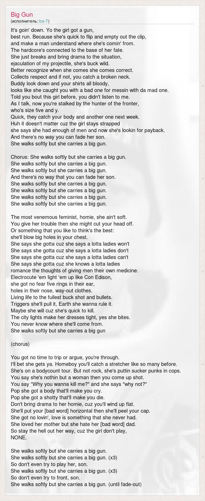 It's goin' down. Yo the girl got a gun, best run. Because she's quick to flip and empty out the clip, and make a man understand where she's comin' from. The hardcore's connected to the base of her fate. She just breaks and bring drama to the situation, ejaculation of my projectile, she's buck wild. Better recognize when she comes she comes correct. Collects respect and if not, you catch a broken neck. Buddy look down and your shirts all bloody, looks like she caught you with a bad one for messin with da mad one. Told you bout this girl before, you didn't listen to me. As I talk, now you're stalked by the hunter of the fronter, who's size five and y. Quick, they catch your body and another one next week. Huh it doesn't matter cuz the girl stays strapped she says she had enough of men and now she's lookin for payback. And there's no way you can fade her son. She walks softly but she carries a big gun. Chorus: She walks softly but she carries a big gun. She walks softly but she carries a big gun. She walks softly but she carries a big gun. And there's no way that you can fade her son. She walks softly but she carries a big gun. She walks softly but she carries a big gun. She walks softly but she carries a big gun. She walks softly but she carries a big gun. The most venemous feminist, homie, she ain't soft. You give her trouble then she might cut your head off. Or something that you like to think's the best: she'll blow big holes in your chest. She says she gotta cuz she says a lotta ladies won't She says she gotta cuz she says a lotta ladies don't She says she gotta cuz she says a lotta ladies can't She says she gotta cuz she knows a lotta ladies romance the thoughts of giving men their own medicine. Electrocute 'em light 'em up like Con Edison, she got no fear five rings in their ear, holes in their nose, way-out clothes. Living life to the fullest buck shot and bullets. Triggers she'll pull it, Earth she wanna rule it. Maybe she will cuz she's quick to kill. The city lights make her dresses tight, yes she bites. You never know where she'll come from. She walks softly but she carries a big gun (chorus) You got no time to trip or argue, you're through. I'll bet she gets ya. Homeboy you'll catch a stretcher like so many before. She's on a bodycount tour. But not rock, she's puttin sucker punks in cops. You say she's nothin but a woman then you come up shot. You say "Why you wanna kill me?" and she says "why not?" Pop she got a body that'll make you cry. Pop she got a shotty that'll make you die. Don't bring drama to her homie, cuz you'll wind up flat. She'll put your [bad word] horizontal then she'll peel your cap. She got no lovin', love is something that she never had. She loved her mother but she hate her [bad word] dad. So stay the hell out her way, cuz the girl don't play, NONE. She walks softly but she carries a big gun. She walks softly but she carries a big gun. (x3) So don't even try to play her, son. She walks softly but she carries a big gun. (x3) So don't even try to front, son. She walks softly but she carries a big gun. (until fade-out)