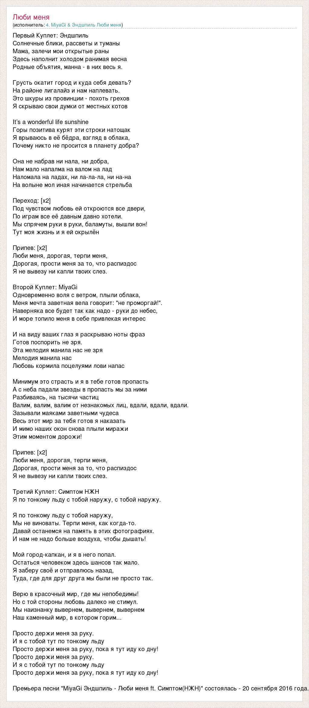 Первый Куплет: Эндшпиль Солнечные блики, рассветы и туманы Мама, залечи мои открытые раны Здесь наполнит холодом ранимая весна Родные объятия, манна - в них весь я. Грусть окатит город и куда себя девать? На районе лигалайз и нам наплевать. Это шкуры из провинции - похоть грехов Я скрываю свои думки от местных котов It’s a wonderful life sunshine Горы позитива курят эти строки натощак Я врываюсь в её бёдра, взгляд в облака, Почему никто не просится в планету добра? Она не набрав ни нала, ни добра, Нам мало напалма на валом на лад Наломала на ладах, ни ла-ла-ла, ни на-на На волыне мол иная начинается стрельба Переход: [х2] Под чувством любовь ей откроются все двери, По играм все её давным давно хотели. Мы спрячем руки в руки, баламуты, вышли вон! Тут моя жизнь и я ей окрылён Припев: [х2] Люби меня, дорогая, терпи меня, Дорогая, прости меня за то, что распиздос Я не вывезу ни капли твоих слез. Второй Куплет: MiyaGi Одновременно воля с ветром, плыли облака, Меня мечта заветная вела говорит: "не проморгай!". Наверняка все будет так как надо - руки до небес, И море топило меня в себе привлекая интерес И на виду ваших глаз я раскрываю ноты фраз Готов поспорить не зря. Эта мелодия манила нас не зря Мелодия манила нас Любовь кормила поцелуями лови напас Минимум это страсть и я в тебе готов пропасть А с неба падали звезды в пропасть мы за ними Разбиваясь, на тысячи частиц Валим, валим, валим от незнакомых лиц, вдали, вдали, вдали. Зазывали маяками заветными чудеса Весь этот мир за тебя готов я наказать И мимо наших окон снова плыли миражи Этим моментом дорожи! Припев: [х2] Люби меня, дорогая, терпи меня, Дорогая, прости меня за то, что распиздос Я не вывезу ни капли твоих слез. Третий Куплет: Симптом НЖН Я по тонкому льду с тобой наружу, с тобой наружу. Я по тонкому льду с тобой наружу, Мы не виноваты. Терпи меня, как когда-то. Давай останемся на память в этих фотографиях. И нам не надо больше воздуха, чтобы дышать! Мой город-капкан, и я в него попал. Остаться человеком здесь шансов так мало. Я заберу своё и отправлюсь назад, Туда, где для друг друга мы были не просто так. Верю в красочный мир, где мы непобедимы! Но с той стороны любовь далеко не стимул. Мы наизнанку вывернем, вывернем, вывернем Наш каменный мир, в котором горим... Просто держи меня за руку. И я с тобой тут по тонкому льду Просто держи меня за руку, пока я тут иду ко дну! Просто держи меня за руку. И я с тобой тут по тонкому льду Просто держи меня за руку, пока я тут иду ко дну! Премьера песни "MiyaGi Эндшпиль - Люби меня ft. Симптом(НЖН)" состоялась - 20 сентября 2016 года.