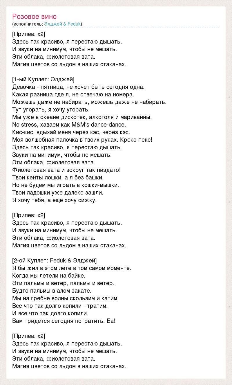 [Припев: х2] Здесь так красиво, я перестаю дышать. И звуки на минимум, чтобы не мешать. Эти облака, фиолетовая вата. Магия цветов со льдом в наших стаканах. [1-ый Куплет: Элджей] Девочка - пятница, не хочет быть сегодня одна. Какая разница где я, не отвечаю на номера. Можешь даже не набирать, можешь даже не набирать. Тут угорать, я хочу угорать. Мы уже в океане дискотек, алкоголя и мариванны. No stress, хаваем как M&M's dance-dance. Кис-кис, вдыхай меня через кэс, через кэс. Моя волшебная палочка в твоих руках. Крекс-пекс! Здесь так красиво, я перестаю дышать. Звуки на минимум, чтобы не мешать. Эти облака, фиолетовая вата. Фиолетовая вата и вокруг так пиздато! Твои кенты лошки, а я без башки. Но не будем мы играть в кошки-мышки. Твои ладошки уже далеко зашли. Я хочу тебя, а еще хочу сижку. [Припев: х2] Здесь так красиво, я перестаю дышать. И звуки на минимум, чтобы не мешать. Эти облака, фиолетовая вата. Магия цветов со льдом в наших стаканах. [2-ой Куплет: Feduk & Элджей] Я бы жил в этом лете в том самом моменте. Когда мы летели на байке. Эти пальмы и ветер, пальмы и ветер. Будто пальмы в алом закате. Мы на гребне волны скользим и катим, Все что так долго копили - тратим. И все что так долго копили. Вам придется сегодня потратить. Еа! [Припев: х2] Здесь так красиво, я перестаю дышать. И звуки на минимум, чтобы не мешать. Эти облака, фиолетовая вата. Магия цветов со льдом в наших стаканах.