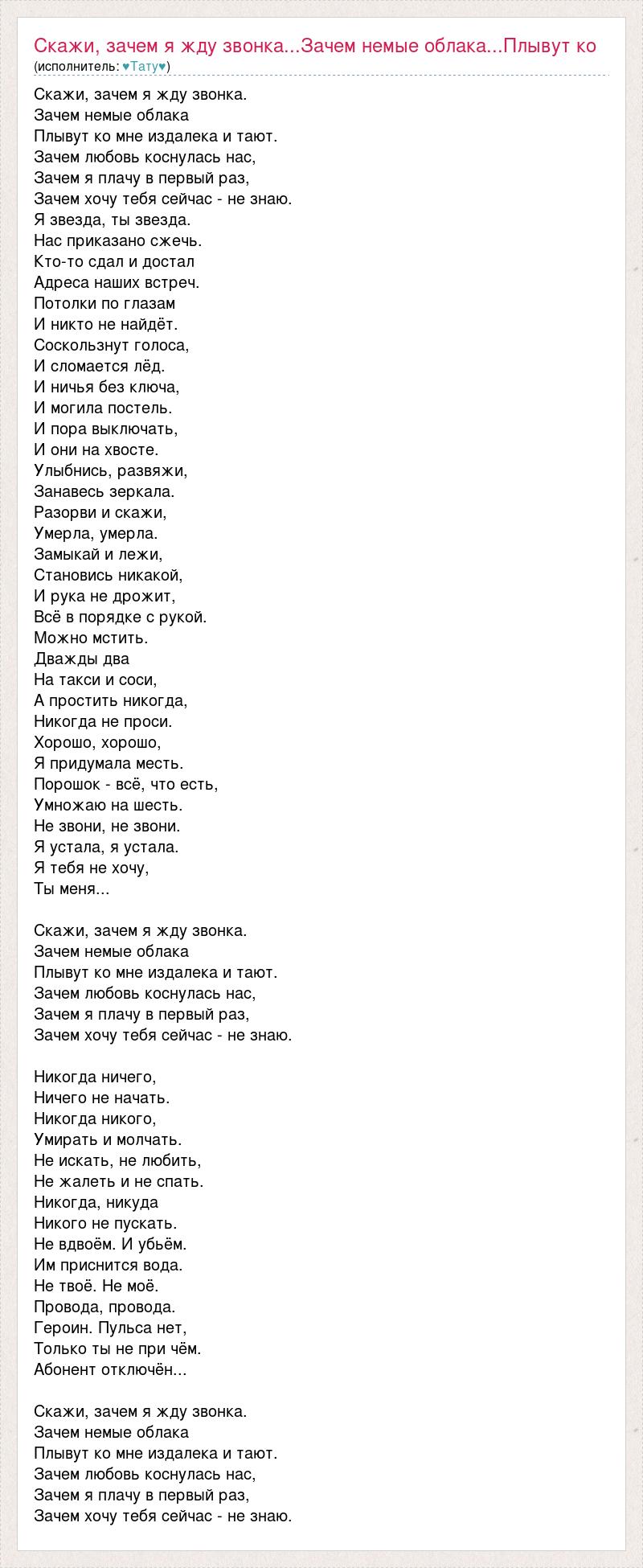 Скажи, зачем я жду звонка. Зачем немые облака Плывут ко мне издалека и тают. Зачем любовь коснулась нас, Зачем я плачу в первый раз, Зачем хочу тебя сейчас - не знаю. Я звезда, ты звезда. Нас приказано сжечь. Кто-то сдал и достал Адреса наших встреч. Потолки по глазам И никто не найдёт. Соскользнут голоса, И сломается лёд. И ничья без ключа, И могила постель. И пора выключать, И они на хвосте. Улыбнись, развяжи, Занавесь зеркала. Разорви и скажи, Умерла, умерла. Замыкай и лежи, Становись никакой, И рука не дрожит, Всё в порядке с рукой. Можно мстить. Дважды два На такси и соси, А простить никогда, Никогда не проси. Хорошо, хорошо, Я придумала месть. Порошок - всё, что есть, Умножаю на шесть. Не звони, не звони. Я устала, я устала. Я тебя не хочу, Ты меня... Скажи, зачем я жду звонка. Зачем немые облака Плывут ко мне издалека и тают. Зачем любовь коснулась нас, Зачем я плачу в первый раз, Зачем хочу тебя сейчас - не знаю. Никогда ничего, Ничего не начать. Никогда никого, Умирать и молчать. Не искать, не любить, Не жалеть и не спать. Никогда, никуда Никого не пускать. Не вдвоём. И убьём. Им приснится вода. Не твоё. Не моё. Провода, провода. Героин. Пульса нет, Только ты не при чём. Абонент отключён... Скажи, зачем я жду звонка. Зачем немые облака Плывут ко мне издалека и тают. Зачем любовь коснулась нас, Зачем я плачу в первый раз, Зачем хочу тебя сейчас - не знаю.