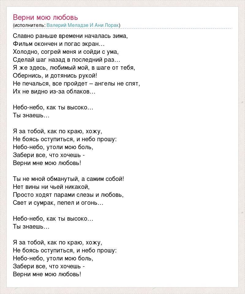 Славно раньше времени началась зима, Фильм окончен и погас экран… Холодно, согрей меня и сойди с ума, Сделай шаг назад в последний раз… Я же здесь, любимый мой, в шаге от тебя, Обернись, и дотянись рукой! Не печалься, все пройдет – ангелы не спят, Их не видно из-за облаков… Небо-небо, как ты высоко… Ты знаешь… Я за тобой, как по краю, хожу, Не боясь оступиться, и небо прошу: Небо-небо, утоли мою боль, Забери все, что хочешь - Верни мне мою любовь! Ты не мной обманутый, а самим собой! Нет вины ни чьей никакой, Просто ходят парами слезы и любовь, Свет и сумрак, пепел и огонь… Небо-небо, как ты высоко… Ты знаешь… Я за тобой, как по краю, хожу, Не боясь оступиться, и небо прошу: Небо-небо, утоли мою боль, Забери все, что хочешь - Верни мне мою любовь!