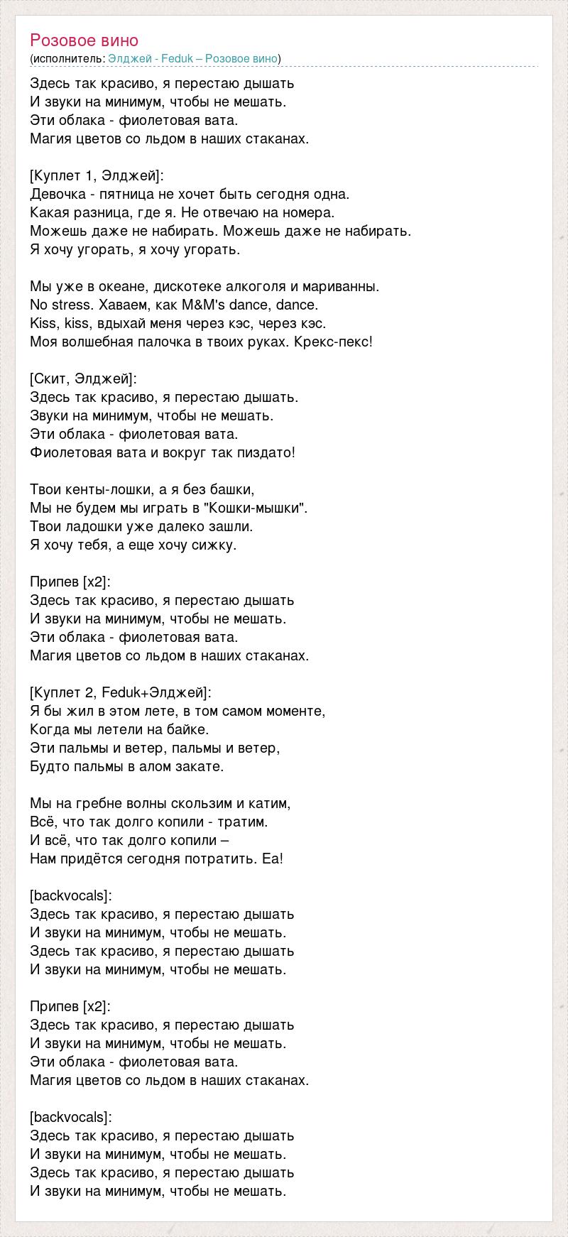 Здесь так красиво, я перестаю дышать И звуки на минимум, чтобы не мешать. Эти облака - фиолетовая вата. Магия цветов со льдом в наших стаканах. [Куплет 1, Элджей]: Девочка - пятница не хочет быть сегодня одна. Какая разница, где я. Не отвечаю на номера. Можешь даже не набирать. Можешь даже не набирать. Я хочу угорать, я хочу угорать. Мы уже в океане, дискотеке алкоголя и мариванны. No stress. Хаваем, как M&M's dance, dance. Kiss, kiss, вдыхай меня через кэс, через кэс. Моя волшебная палочка в твоих руках. Крекс-пекс! [Скит, Элджей]: Здесь так красиво, я перестаю дышать. Звуки на минимум, чтобы не мешать. Эти облака - фиолетовая вата. Фиолетовая вата и вокруг так пиздато! Твои кенты-лошки, а я без башки, Мы не будем мы играть в "Кошки-мышки". Твои ладошки уже далеко зашли. Я хочу тебя, а еще хочу сижку. Припев [x2]: Здесь так красиво, я перестаю дышать И звуки на минимум, чтобы не мешать. Эти облака - фиолетовая вата. Магия цветов со льдом в наших стаканах. [Куплет 2, Feduk+Элджей]: Я бы жил в этом лете, в том самом моменте, Когда мы летели на байке. Эти пальмы и ветер, пальмы и ветер, Будто пальмы в алом закате. Мы на гребне волны скользим и катим, Всё, что так долго копили - тратим. И всё, что так долго копили – Нам придётся сегодня потратить. Еа! [backvocals]: Здесь так красиво, я перестаю дышать И звуки на минимум, чтобы не мешать. Здесь так красиво, я перестаю дышать И звуки на минимум, чтобы не мешать. Припев [x2]: Здесь так красиво, я перестаю дышать И звуки на минимум, чтобы не мешать. Эти облака - фиолетовая вата. Магия цветов со льдом в наших стаканах. [backvocals]: Здесь так красиво, я перестаю дышать И звуки на минимум, чтобы не мешать. Здесь так красиво, я перестаю дышать И звуки на минимум, чтобы не мешать.