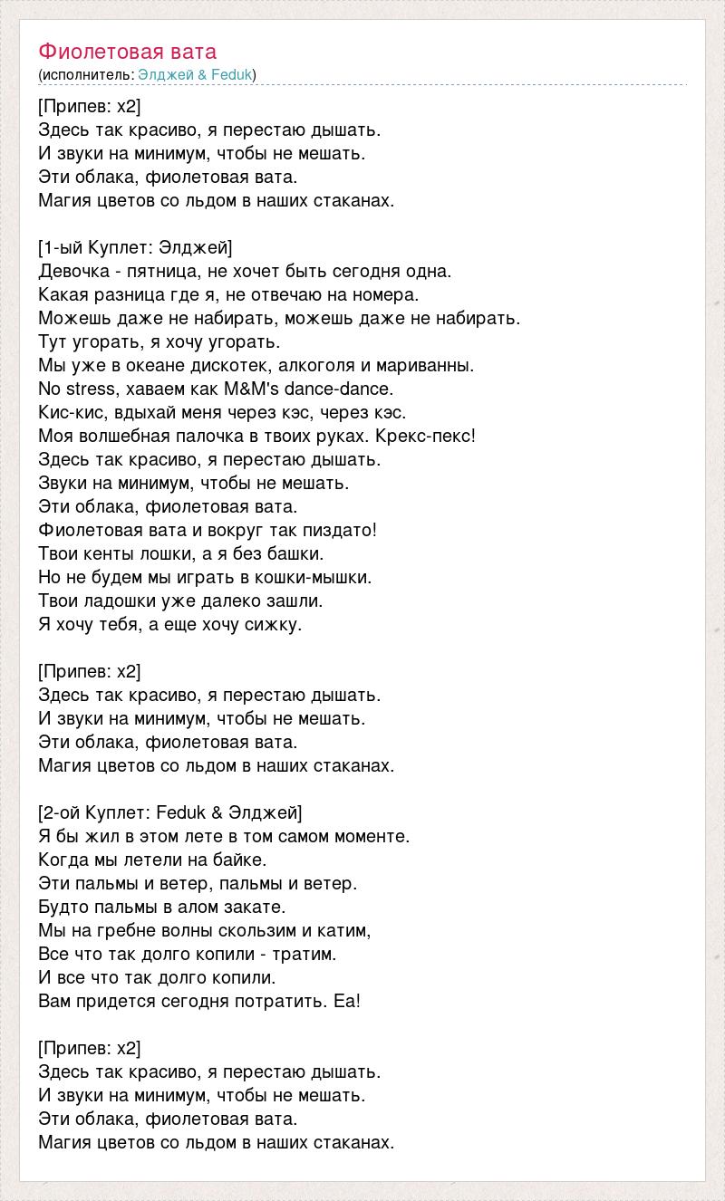 [Припев: х2] Здесь так красиво, я перестаю дышать. И звуки на минимум, чтобы не мешать. Эти облака, фиолетовая вата. Магия цветов со льдом в наших стаканах. [1-ый Куплет: Элджей] Девочка - пятница, не хочет быть сегодня одна. Какая разница где я, не отвечаю на номера. Можешь даже не набирать, можешь даже не набирать. Тут угорать, я хочу угорать. Мы уже в океане дискотек, алкоголя и мариванны. No stress, хаваем как M&M's dance-dance. Кис-кис, вдыхай меня через кэс, через кэс. Моя волшебная палочка в твоих руках. Крекс-пекс! Здесь так красиво, я перестаю дышать. Звуки на минимум, чтобы не мешать. Эти облака, фиолетовая вата. Фиолетовая вата и вокруг так пиздато! Твои кенты лошки, а я без башки. Но не будем мы играть в кошки-мышки. Твои ладошки уже далеко зашли. Я хочу тебя, а еще хочу сижку. [Припев: х2] Здесь так красиво, я перестаю дышать. И звуки на минимум, чтобы не мешать. Эти облака, фиолетовая вата. Магия цветов со льдом в наших стаканах. [2-ой Куплет: Feduk & Элджей] Я бы жил в этом лете в том самом моменте. Когда мы летели на байке. Эти пальмы и ветер, пальмы и ветер. Будто пальмы в алом закате. Мы на гребне волны скользим и катим, Все что так долго копили - тратим. И все что так долго копили. Вам придется сегодня потратить. Еа! [Припев: х2] Здесь так красиво, я перестаю дышать. И звуки на минимум, чтобы не мешать. Эти облака, фиолетовая вата. Магия цветов со льдом в наших стаканах.