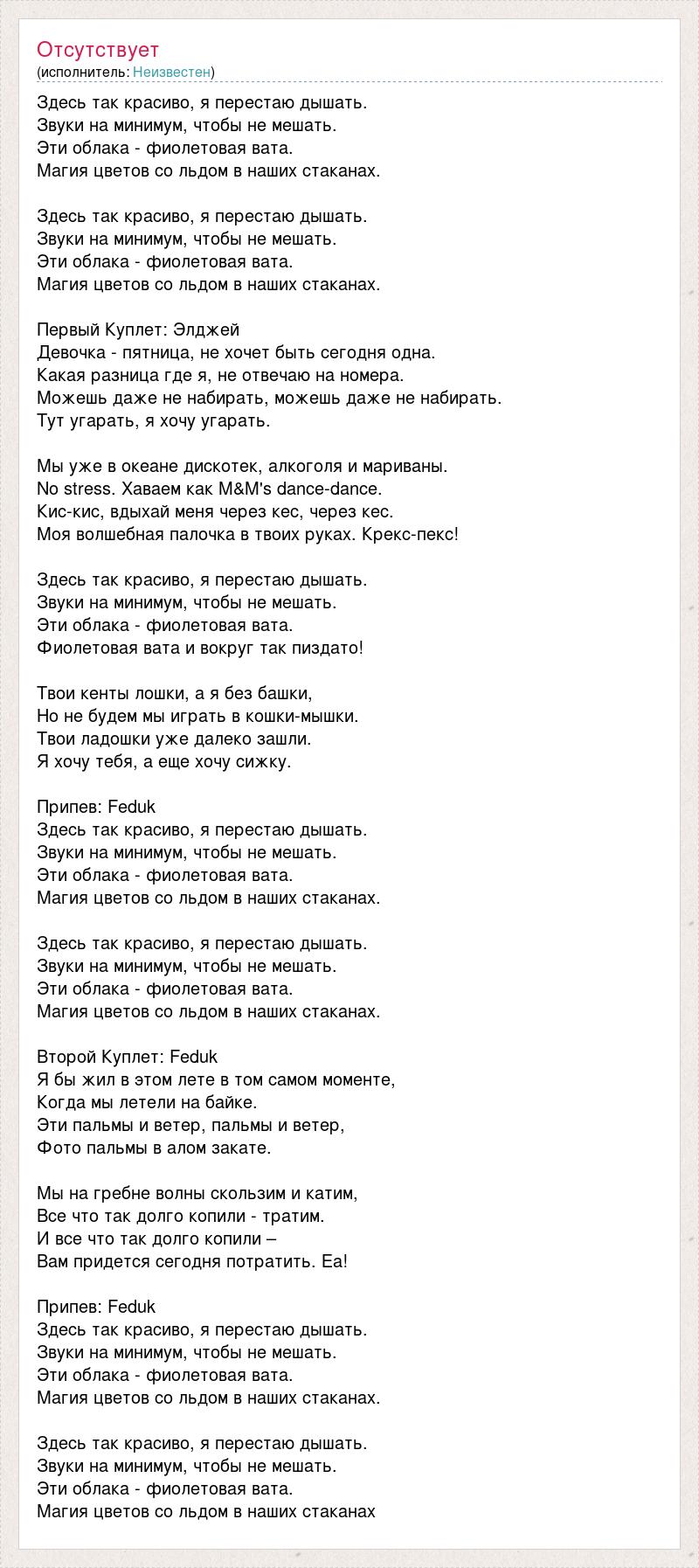Здесь так красиво, я перестаю дышать. Звуки на минимум, чтобы не мешать. Эти облака - фиолетовая вата. Магия цветов со льдом в наших стаканах. Здесь так красиво, я перестаю дышать. Звуки на минимум, чтобы не мешать. Эти облака - фиолетовая вата. Магия цветов со льдом в наших стаканах. Первый Куплет: Элджей Девочка - пятница, не хочет быть сегодня одна. Какая разница где я, не отвечаю на номера. Можешь даже не набирать, можешь даже не набирать. Тут угарать, я хочу угарать. Мы уже в океане дискотек, алкоголя и мариваны. No stress. Хаваем как M&M's dance-dance. Кис-кис, вдыхай меня через кес, через кес. Моя волшебная палочка в твоих руках. Крекс-пекс! Здесь так красиво, я перестаю дышать. Звуки на минимум, чтобы не мешать. Эти облака - фиолетовая вата. Фиолетовая вата и вокруг так пиздато! Твои кенты лошки, а я без башки, Но не будем мы играть в кошки-мышки. Твои ладошки уже далеко зашли. Я хочу тебя, а еще хочу сижку. Припев: Feduk Здесь так красиво, я перестаю дышать. Звуки на минимум, чтобы не мешать. Эти облака - фиолетовая вата. Магия цветов со льдом в наших стаканах. Здесь так красиво, я перестаю дышать. Звуки на минимум, чтобы не мешать. Эти облака - фиолетовая вата. Магия цветов со льдом в наших стаканах. Второй Куплет: Feduk Я бы жил в этом лете в том самом моменте, Когда мы летели на байке. Эти пальмы и ветер, пальмы и ветер, Фото пальмы в алом закате. Мы на гребне волны скользим и катим, Все что так долго копили - тратим. И все что так долго копили – Вам придется сегодня потратить. Еа! Припев: Feduk Здесь так красиво, я перестаю дышать. Звуки на минимум, чтобы не мешать. Эти облака - фиолетовая вата. Магия цветов со льдом в наших стаканах. Здесь так красиво, я перестаю дышать. Звуки на минимум, чтобы не мешать. Эти облака - фиолетовая вата. Магия цветов со льдом в наших стаканах