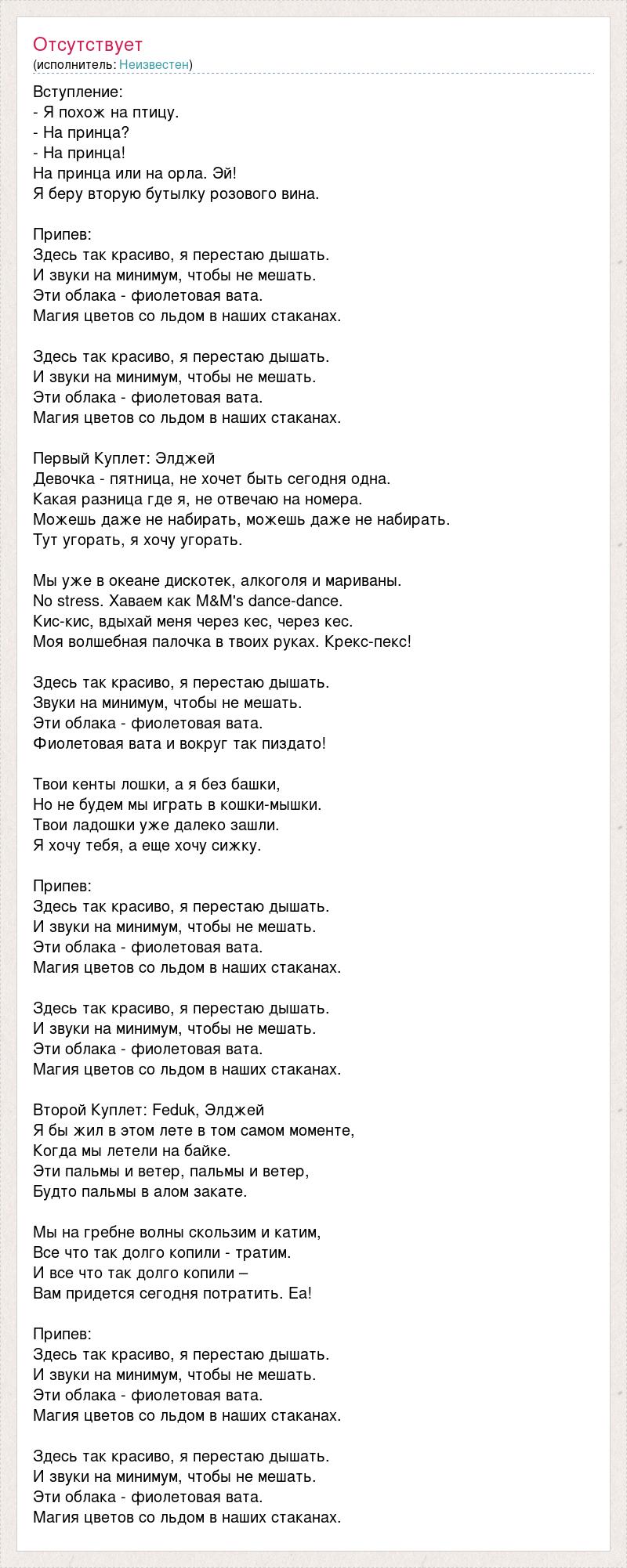 Вступление: - Я похож на птицу. - На принца? - На принца! На принца или на орла. Эй! Я беру вторую бутылку розового вина. Припев: Здесь так красиво, я перестаю дышать. И звуки на минимум, чтобы не мешать. Эти облака - фиолетовая вата. Магия цветов со льдом в наших стаканах. Здесь так красиво, я перестаю дышать. И звуки на минимум, чтобы не мешать. Эти облака - фиолетовая вата. Магия цветов со льдом в наших стаканах. Первый Куплет: Элджей Девочка - пятница, не хочет быть сегодня одна. Какая разница где я, не отвечаю на номера. Можешь даже не набирать, можешь даже не набирать. Тут угорать, я хочу угорать. Мы уже в океане дискотек, алкоголя и мариваны. No stress. Хаваем как M&M's dance-dance. Кис-кис, вдыхай меня через кес, через кес. Моя волшебная палочка в твоих руках. Крекс-пекс! Здесь так красиво, я перестаю дышать. Звуки на минимум, чтобы не мешать. Эти облака - фиолетовая вата. Фиолетовая вата и вокруг так пиздато! Твои кенты лошки, а я без башки, Но не будем мы играть в кошки-мышки. Твои ладошки уже далеко зашли. Я хочу тебя, а еще хочу сижку. Припев: Здесь так красиво, я перестаю дышать. И звуки на минимум, чтобы не мешать. Эти облака - фиолетовая вата. Магия цветов со льдом в наших стаканах. Здесь так красиво, я перестаю дышать. И звуки на минимум, чтобы не мешать. Эти облака - фиолетовая вата. Магия цветов со льдом в наших стаканах. Второй Куплет: Feduk, Элджей Я бы жил в этом лете в том самом моменте, Когда мы летели на байке. Эти пальмы и ветер, пальмы и ветер, Будто пальмы в алом закате. Мы на гребне волны скользим и катим, Все что так долго копили - тратим. И все что так долго копили – Вам придется сегодня потратить. Еа! Припев: Здесь так красиво, я перестаю дышать. И звуки на минимум, чтобы не мешать. Эти облака - фиолетовая вата. Магия цветов со льдом в наших стаканах. Здесь так красиво, я перестаю дышать. И звуки на минимум, чтобы не мешать. Эти облака - фиолетовая вата. Магия цветов со льдом в наших стаканах.