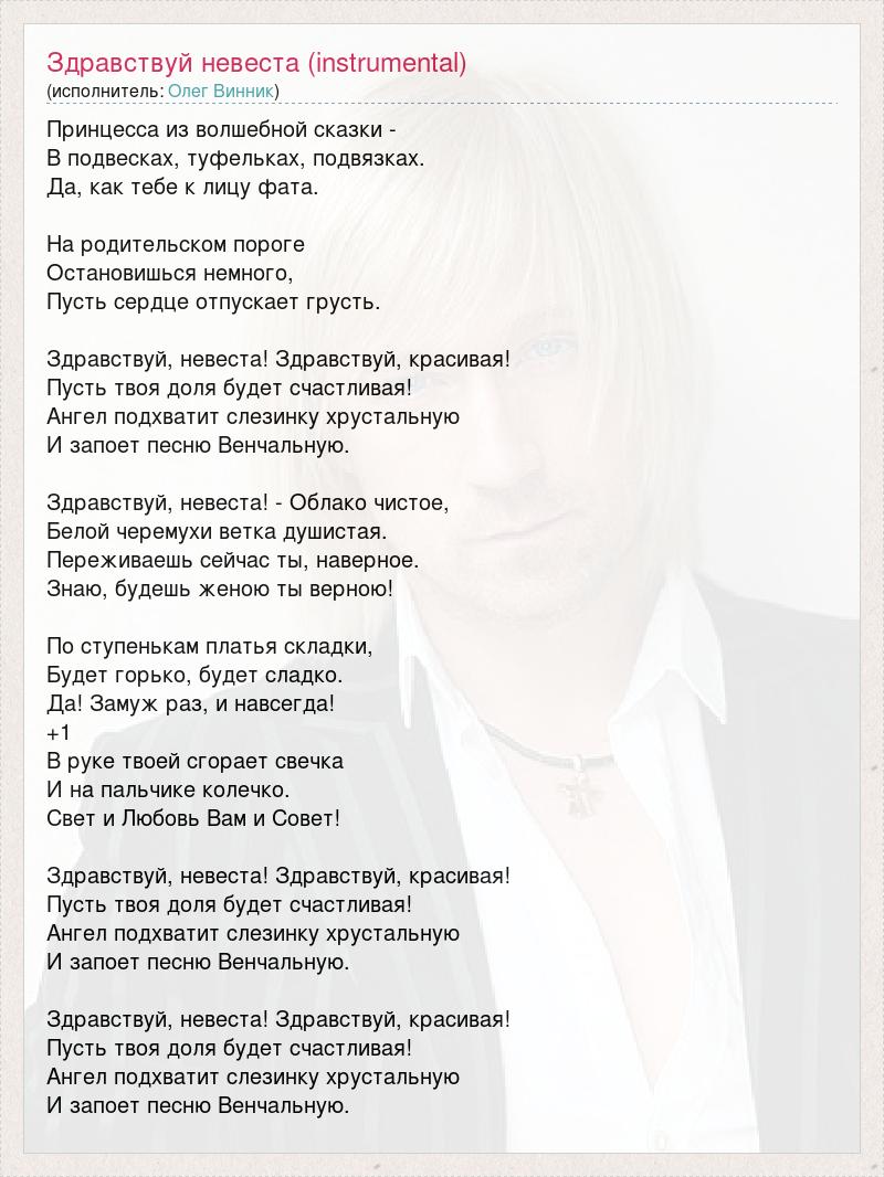 Принцесса из волшебной сказки - В подвесках, туфельках, подвязках. Да, как тебе к лицу фата. На родительском пороге Остановишься немного, Пусть сердце отпускает грусть. Здравствуй, невеста! Здравствуй, красивая! Пусть твоя доля будет счастливая! Ангел подхватит слезинку хрустальную И запоет песню Венчальную. Здравствуй, невеста! - Облако чистое, Белой черемухи ветка душистая. Переживаешь сейчас ты, наверное. Знаю, будешь женою ты верною! По ступенькам платья складки, Будет горько, будет сладко. Да! Замуж раз, и навсегда! +1 В руке твоей сгорает свечка И на пальчике колечко. Свет и Любовь Вам и Совет! Здравствуй, невеста! Здравствуй, красивая! Пусть твоя доля будет счастливая! Ангел подхватит слезинку хрустальную И запоет песню Венчальную. Здравствуй, невеста! Здравствуй, красивая! Пусть твоя доля будет счастливая! Ангел подхватит слезинку хрустальную И запоет песню Венчальную.