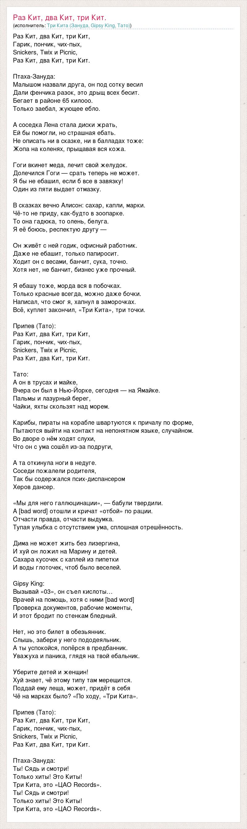 Раз Кит, два Кит, три Кит, Гарик, пончик, чих-пых, Snickers, Twix и Picnic, Раз Кит, два Кит, три Кит. Птаха-Зануда: Малышом назвали друга, он под сотку весил Дали фенчика разок, это дрыщ всех бесит. Бегает в районе 65 килооо. Только заебал, жующее ебло. А соседка Лена стала диски жрать, Ей бы помогли, но страшная ебать. Не описать ни в сказке, ни в балладах тоже: Жопа на коленях, прыщавая вся кожа. Гоги вкинет меда, лечит свой желудок. Долечился Гоги — срать теперь не может. Я бы не ебашил, если б все в завязку! Один из пяти выдает отмазку. В сказках вечно Алисон: сахар, капли, марки. Чё-то не приду, как-будто в зоопарке. То она гадюка, то олень, белуга. Я её боюсь, респектую другу — Он живёт с ней годик, офисный работник. Даже не ебашит, только папиросит. Ходит он с весами, банчит, сука, точно. Хотя нет, не банчит, бизнес уже прочный. Я ебашу тоже, морда вся в побочках. Только красные всегда, можно даже бочки. Написал, что смог я, хапнул в заморочках. Всё, куплет закончил, «Три Кита», три точки. Припев (Тато): Раз Кит, два Кит, три Кит, Гарик, пончик, чих-пых, Snickers, Twix и Picnic, Раз Кит, два Кит, три Кит. Тато: А он в трусах и майке, Вчера он был в Нью-Йорке, сегодня — на Ямайке. Пальмы и лазурный берег, Чайки, яхты скользят над морем. Карибы, пираты на корабле швартуются к причалу по форме, Пытаются выйти на контакт на непонятном языке, случайном. Во дворе о нём ходят слухи, Что он с ума сошёл из-за подруги, А та откинула ноги в недуге. Соседи пожалели родителя, Так бы содержался псих-диспансером Херов дансер. «Мы для него галлюцинации», — бабули твердили. А [bad word] отошли и кричат «отбой» по рации. Отчасти правда, отчасти выдумка. Тупая улыбка с отсутствием ума, сплошная отрешённость. Дима не может жить без лизергина, И хуй он ложил на Марину и детей. Сахара кусочек с каплей из пипетки И воды глоточек, чтоб было веселей. Gipsy King: Вызывай «03», он съел кислоты… Врачей на помощь, хотя с ними [bad word] Проверка документов, рабочие моменты, И этот бродит по стенкам бледный. Нет, но это билет в обезьянник. Слышь, забери у него пододеяльник. А ты успокойся, попёрся в предбанник. Уважуха и паника, глядя на твой ебальник. Уберите детей и женщин! Хуй знает, чё этому типу там мерещится. Поддай ему леща, может, придёт в себя Чё на марках было? «По ходу, «Три Кита». Припев (Тато): Раз Кит, два Кит, три Кит, Гарик, пончик, чих-пых, Snickers, Twix и Picnic, Раз Кит, два Кит, три Кит. Птаха-Зануда: Ты! Сядь и смотри! Только хиты! Это Киты! Три Кита, это «ЦАО Records». Ты! Сядь и смотри! Только хиты! Это Киты! Три Кита, это «ЦАО Records».