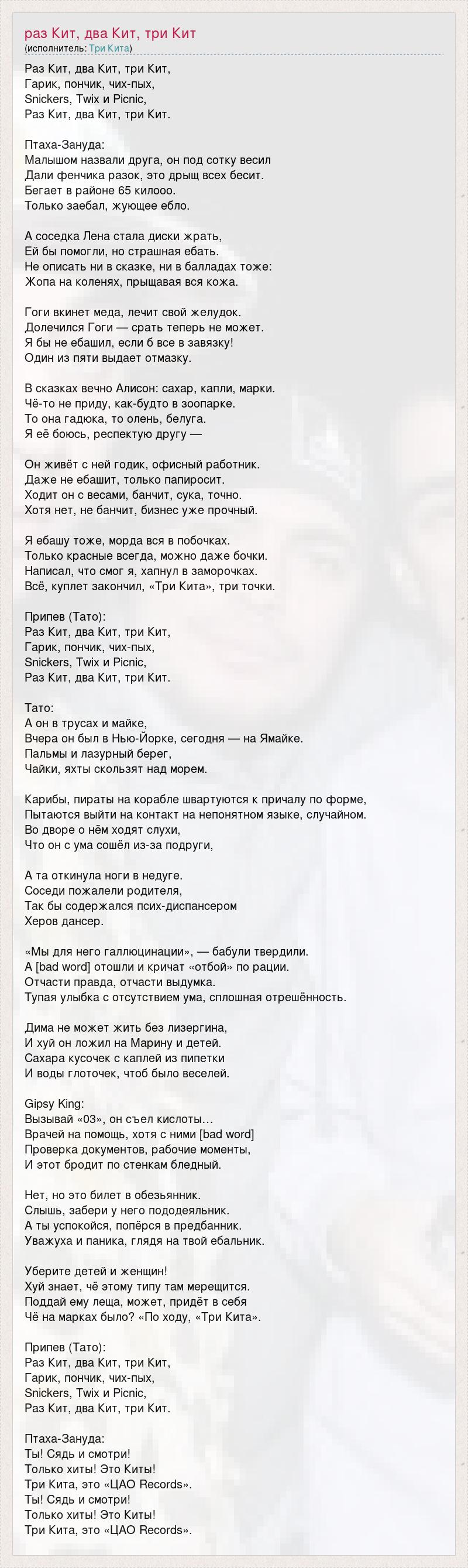 Раз Кит, два Кит, три Кит, Гарик, пончик, чих-пых, Snickers, Twix и Picnic, Раз Кит, два Кит, три Кит. Птаха-Зануда: Малышом назвали друга, он под сотку весил Дали фенчика разок, это дрыщ всех бесит. Бегает в районе 65 килооо. Только заебал, жующее ебло. А соседка Лена стала диски жрать, Ей бы помогли, но страшная ебать. Не описать ни в сказке, ни в балладах тоже: Жопа на коленях, прыщавая вся кожа. Гоги вкинет меда, лечит свой желудок. Долечился Гоги — срать теперь не может. Я бы не ебашил, если б все в завязку! Один из пяти выдает отмазку. В сказках вечно Алисон: сахар, капли, марки. Чё-то не приду, как-будто в зоопарке. То она гадюка, то олень, белуга. Я её боюсь, респектую другу — Он живёт с ней годик, офисный работник. Даже не ебашит, только папиросит. Ходит он с весами, банчит, сука, точно. Хотя нет, не банчит, бизнес уже прочный. Я ебашу тоже, морда вся в побочках. Только красные всегда, можно даже бочки. Написал, что смог я, хапнул в заморочках. Всё, куплет закончил, «Три Кита», три точки. Припев (Тато): Раз Кит, два Кит, три Кит, Гарик, пончик, чих-пых, Snickers, Twix и Picnic, Раз Кит, два Кит, три Кит. Тато: А он в трусах и майке, Вчера он был в Нью-Йорке, сегодня — на Ямайке. Пальмы и лазурный берег, Чайки, яхты скользят над морем. Карибы, пираты на корабле швартуются к причалу по форме, Пытаются выйти на контакт на непонятном языке, случайном. Во дворе о нём ходят слухи, Что он с ума сошёл из-за подруги, А та откинула ноги в недуге. Соседи пожалели родителя, Так бы содержался псих-диспансером Херов дансер. «Мы для него галлюцинации», — бабули твердили. А [bad word] отошли и кричат «отбой» по рации. Отчасти правда, отчасти выдумка. Тупая улыбка с отсутствием ума, сплошная отрешённость. Дима не может жить без лизергина, И хуй он ложил на Марину и детей. Сахара кусочек с каплей из пипетки И воды глоточек, чтоб было веселей. Gipsy King: Вызывай «03», он съел кислоты… Врачей на помощь, хотя с ними [bad word] Проверка документов, рабочие моменты, И этот бродит по стенкам бледный. Нет, но это билет в обезьянник. Слышь, забери у него пододеяльник. А ты успокойся, попёрся в предбанник. Уважуха и паника, глядя на твой ебальник. Уберите детей и женщин! Хуй знает, чё этому типу там мерещится. Поддай ему леща, может, придёт в себя Чё на марках было? «По ходу, «Три Кита». Припев (Тато): Раз Кит, два Кит, три Кит, Гарик, пончик, чих-пых, Snickers, Twix и Picnic, Раз Кит, два Кит, три Кит. Птаха-Зануда: Ты! Сядь и смотри! Только хиты! Это Киты! Три Кита, это «ЦАО Records». Ты! Сядь и смотри! Только хиты! Это Киты! Три Кита, это «ЦАО Records».