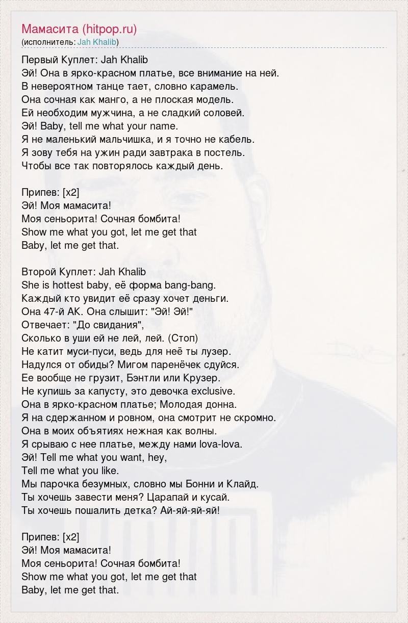 Первый Куплет: Jah Khalib Эй! Она в ярко-красном платье, все внимание на ней. В невероятном танце тает, словно карамель. Она сочная как манго, а не плоская модель. Ей необходим мужчина, а не сладкий соловей. Эй! Baby, tell me what your name. Я не маленький мальчишка, и я точно не кабель. Я зову тебя на ужин ради завтрака в постель. Чтобы все так повторялось каждый день. Припев: [x2] Эй! Моя мамасита! Моя сеньорита! Сочная бомбита! Show me what you got, let me get that Baby, let me get that. Второй Куплет: Jah Khalib She is hottest baby, её форма bang-bang. Каждый кто увидит её сразу хочет деньги. Она 47-й АК. Она слышит: "Эй! Эй!" Отвечает: "До свидания", Сколько в уши ей не лей, лей. (Стоп) Не катит муси-пуси, ведь для неё ты лузер. Надулся от обиды? Мигом паренёчек сдуйся. Ее вообще не грузит, Бэнтли или Крузер. Не купишь за капусту, это девочка exclusive. Она в ярко-красном платье; Молодая донна. Я на сдержанном и ровном, она смотрит не скромно. Она в моих объятиях нежная как волны. Я срываю с нее платье, между нами lova-lova. Эй! Tell me what you want, hey, Tell me what you like. Мы парочка безумных, словно мы Бонни и Клайд. Ты хочешь завести меня? Царапай и кусай. Ты хочешь пошалить детка? Ай-яй-яй-яй! Припев: [x2] Эй! Моя мамасита! Моя сеньорита! Сочная бомбита! Show me what you got, let me get that Baby, let me get that.