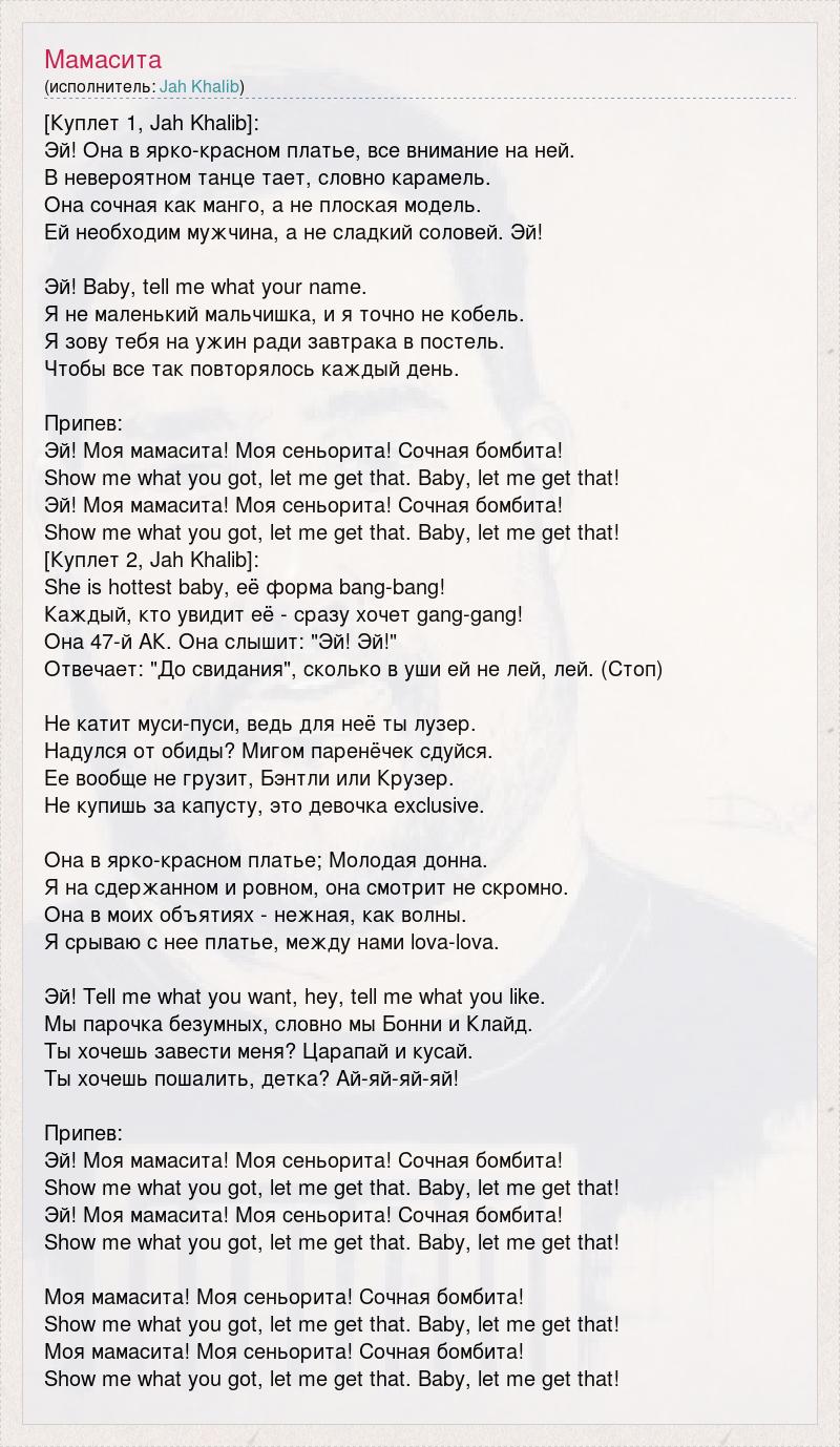 [Куплет 1, Jah Khalib]: Эй! Она в ярко-красном платье, все внимание на ней. В невероятном танце тает, словно карамель. Она сочная как манго, а не плоская модель. Ей необходим мужчина, а не сладкий соловей. Эй! Эй! Baby, tell me what your name. Я не маленький мальчишка, и я точно не кобель. Я зову тебя на ужин ради завтрака в постель. Чтобы все так повторялось каждый день. Припев: Эй! Моя мамасита! Моя сеньорита! Сочная бомбита! Show me what you got, let me get that. Baby, let me get that! Эй! Моя мамасита! Моя сеньорита! Сочная бомбита! Show me what you got, let me get that. Baby, let me get that! [Куплет 2, Jah Khalib]: She is hottest baby, её форма bang-bang! Каждый, кто увидит её - сразу хочет gang-gang! Она 47-й АК. Она слышит: "Эй! Эй!" Отвечает: "До свидания", сколько в уши ей не лей, лей. (Стоп) Не катит муси-пуси, ведь для неё ты лузер. Надулся от обиды? Мигом паренёчек сдуйся. Ее вообще не грузит, Бэнтли или Крузер. Не купишь за капусту, это девочка exclusive. Она в ярко-красном платье; Молодая донна. Я на сдержанном и ровном, она смотрит не скромно. Она в моих объятиях - нежная, как волны. Я срываю с нее платье, между нами lova-lova. Эй! Tell me what you want, hey, tell me what you like. Мы парочка безумных, словно мы Бонни и Клайд. Ты хочешь завести меня? Царапай и кусай. Ты хочешь пошалить, детка? Ай-яй-яй-яй! Припев: Эй! Моя мамасита! Моя сеньорита! Сочная бомбита! Show me what you got, let me get that. Baby, let me get that! Эй! Моя мамасита! Моя сеньорита! Сочная бомбита! Show me what you got, let me get that. Baby, let me get that! Моя мамасита! Моя сеньорита! Сочная бомбита! Show me what you got, let me get that. Baby, let me get that! Моя мамасита! Моя сеньорита! Сочная бомбита! Show me what you got, let me get that. Baby, let me get that!