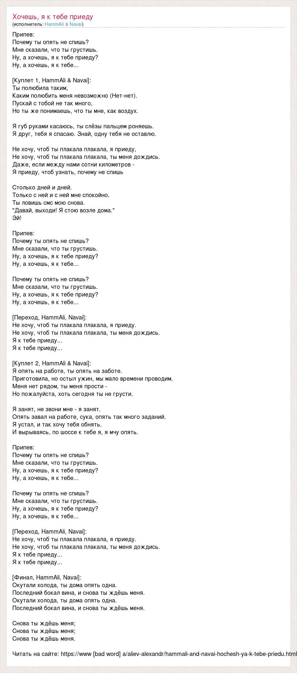 Припев: Почему ты опять не спишь? Мне сказали, что ты грустишь. Ну, а хочешь, я к тебе приеду? Ну, а хочешь, я к тебе... [Куплет 1, HammAli & Navai]: Ты полюбила таким, Каким полюбить меня невозможно (Нет-нет). Пускай с тобой не так много, Но ты же понимаешь, что ты мне, как воздух. Я губ руками касаюсь, ты слёзы пальцем роняешь. Я друг, тебя я спасаю. Знай, одну тебя не оставлю. Не хочу, чтоб ты плакала плакала, я приеду, Не хочу, чтоб ты плакала плакала, ты меня дождись. Даже, если между нами сотни километров - Я приеду, чтоб узнать, почему не спишь Столько дней и дней. Только с ней и с ней мне спокойно. Ты ловишь смс мою снова. "Давай, выходи! Я стою возле дома." Эй! Припев: Почему ты опять не спишь? Мне сказали, что ты грустишь. Ну, а хочешь, я к тебе приеду? Ну, а хочешь, я к тебе... Почему ты опять не спишь? Мне сказали, что ты грустишь. Ну, а хочешь, я к тебе приеду? Ну, а хочешь, я к тебе... [Переход, HammAli, Navai]: Не хочу, чтоб ты плакала плакала, я приеду. Не хочу, чтоб ты плакала плакала, ты меня дождись. Я к тебе приеду... Я к тебе приеду... [Куплет 2, HammAli & Navai]: Я опять на работе, ты опять на заботе. Приготовила, но остыл ужин, мы мало времени проводим. Меня нет рядом, ты меня прости - Но пожалуйста, хоть сегодня ты не грусти. Я занят, не звони мне - я занят. Опять завал на работе, сука, опять так много заданий. Я устал, и так хочу тебя обнять. И вырываясь, по шоссе к тебе я, я мчу опять. Припев: Почему ты опять не спишь? Мне сказали, что ты грустишь. Ну, а хочешь, я к тебе приеду? Ну, а хочешь, я к тебе... Почему ты опять не спишь? Мне сказали, что ты грустишь. Ну, а хочешь, я к тебе приеду? Ну, а хочешь, я к тебе... [Переход, HammAli, Navai]: Не хочу, чтоб ты плакала плакала, я приеду. Не хочу, чтоб ты плакала плакала, ты меня дождись. Я к тебе приеду... Я к тебе приеду... [Финал, HammAli, Navai]: Окутали холода, ты дома опять одна. Последний бокал вина, и снова ты ждёшь меня. Окутали холода, ты дома опять одна. Последний бокал вина, и снова ты ждёшь меня. Снова ты ждёшь меня; Снова ты ждёшь меня; Снова ты ждёшь меня. Читать на сайте: https://www [bad word] a/aliev-alexandr/hammali-and-navai-hochesh-ya-k-tebe-priedu.html