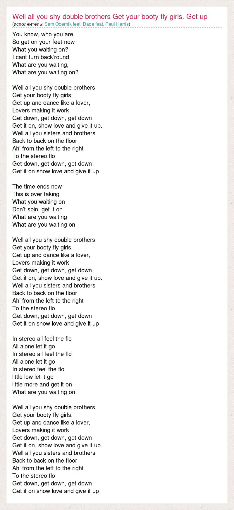 You know, who you are So get on your feet now What you waiting on? I cant turn back’round What are you waiting, What are you waiting on? Well all you shy double brothers Get your booty fly girls. Get up and dance like a lover, Lovers making it work Get down, get down, get down Get it on, show love and give it up. Well all you sisters and brothers Back to back on the floor Ah’ from the left to the right To the stereo flo Get down, get down, get down Get it on show love and give it up The time ends now This is over taking What you waiting on Don’t spin, get it on What are you waiting What are you waiting on Well all you shy double brothers Get your booty fly girls. Get up and dance like a lover, Lovers making it work Get down, get down, get down Get it on, show love and give it up. Well all you sisters and brothers Back to back on the floor Ah’ from the left to the right To the stereo flo Get down, get down, get down Get it on show love and give it up In stereo all feel the flo All alone let it go In stereo all feel the flo All alone let it go In stereo feel the flo little low let it go little more and get it on What are you waiting on Well all you shy double brothers Get your booty fly girls. Get up and dance like a lover, Lovers making it work Get down, get down, get down Get it on, show love and give it up. Well all you sisters and brothers Back to back on the floor Ah’ from the left to the right To the stereo flo Get down, get down, get down Get it on show love and give it up