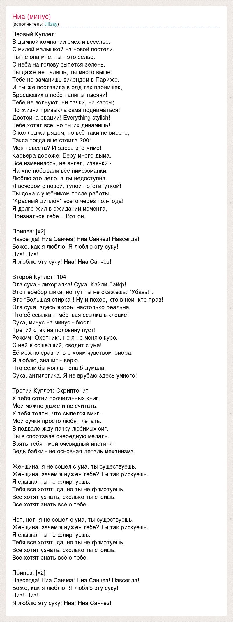 Первый Куплет: В дымной компании смех и веселье. С милой малышкой на новой постели. Ты не она мне, ты - это зелье. С неба на голову сыпется зелень. Ты даже не палишь, ты много выше. Тебе не заманишь викендом в Париже. И ты же поставила в ряд тех парнишек, Бросающих в небо папины тысячи! Тебе не волнуют: ни тачки, ни кассы; По жизни привыкла сама подниматься! Достойна оваций! Everything stylish! Тебе хотят все, но ты их динамишь! С колледжа рядом, но всё-таки не вместе, Такса тогда еще стоила 200! Моя невеста? И здесь это мимо! Карьера дороже. Беру много дыма. Всё изменилось, не ангел, извянки - На мне побывали все нимфоманки. Люблю это дело, а ты недоступна. Я вечером с новой, тупой пр*ституткой! Ты дома с учебником после работы. "Красный диплом" всего через пол-года! Я долго жил в ожидании момента, Признаться тебе... Вот он. Припев: [х2] Навсегда! Ниа Санчез! Ниа Санчез! Навсегда! Боже, как я люблю! Я люблю эту суку! Ниа! Ниа! Я люблю эту суку! Ниа! Ниа Санчез! Второй Куплет: 104 Эта сука - лихорадка! Сука, Кайли Лайф! Это перебор шика, но тут ты не скажешь: "Убавь!". Это "Большая стирка"! Ну и похер, кто в ней, кто прав! Эта сука, здесь якорь, настолько реальна, Что её ссылка, - мёртвая ссылка в клоаке! Сука, минус на минус - бюст! Третий стэк на половину пуст! Режим "Охотник", но я не меняю курс. С ней я сошедший, сводит с ума! Её можно сравнить с моим чувством юмора. Я люблю, значит - верю, Что если бы могла - она б думала. Сука, антилогика. Я не врубаю здесь умного! Третий Куплет: Скриптонит У тебя сотни прочитанных книг. Мои можно даже и не считать. У тебя толпы, что сыпется вмиг. Мои сучки просто любят летать. В подвале жду пачку любимых сиг. Ты в спортзале очередную медаль. Взять тебя - мой очевидный инстинкт. Ведь бабки - не основная деталь механизма. Женщина, я не сошел с ума, ты существуешь. Женщина, зачем я нужен тебе? Ты так рискуешь. Я слышал ты не флиртуешь. Тебя все хотят, да, но ты не флиртуешь. Все хотят узнать, сколько ты стоишь. Все хотят знать всё о тебе. Нет, нет, я не сошел с ума, ты существуешь. Женщина, зачем я нужен тебе? Ты так рискуешь. Я слышал ты не флиртуешь. Тебя все хотят, да, но ты не флиртуешь. Все хотят узнать, сколько ты стоишь. Все хотят знать всё о тебе. Припев: [х2] Навсегда! Ниа Санчез! Ниа Санчез! Навсегда! Боже, как я люблю! Я люблю эту суку! Ниа! Ниа! Я люблю эту суку! Ниа! Ниа Санчез!