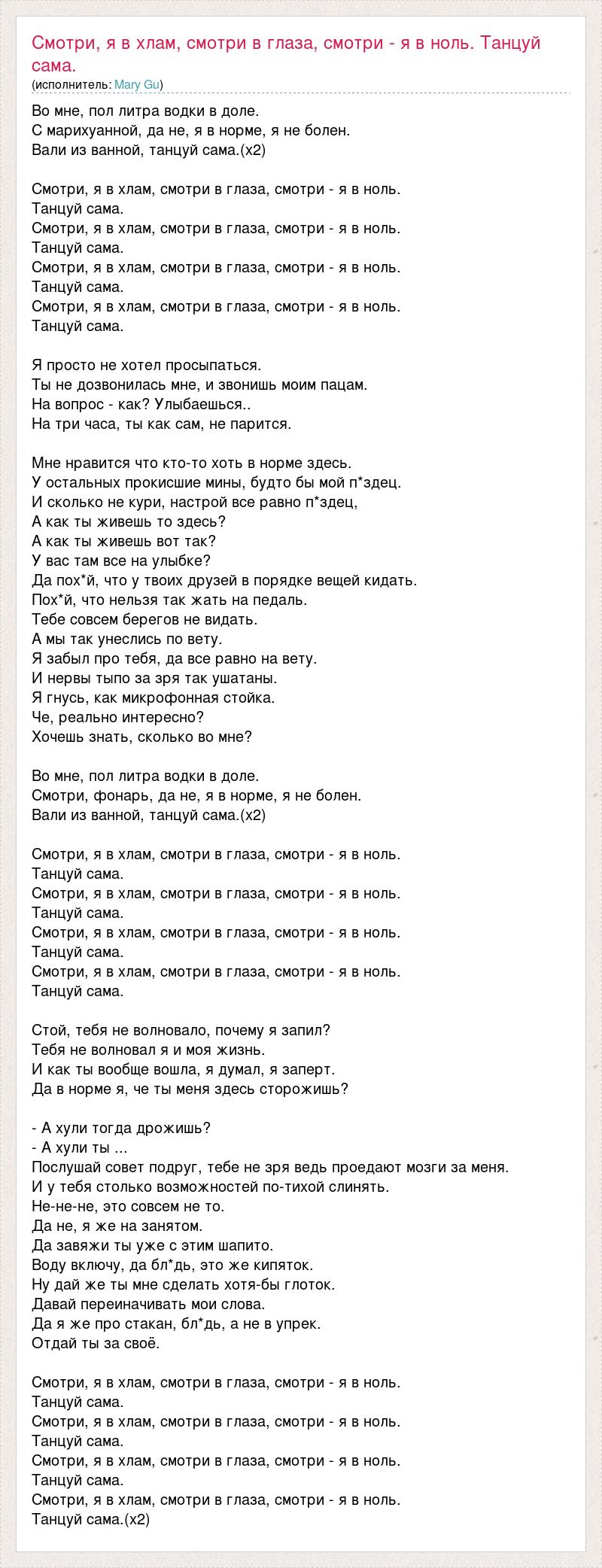 Во мне, пол литра водки в доле. С марихуанной, да не, я в норме, я не болен. Вали из ванной, танцуй сама.(х2) Смотри, я в хлам, смотри в глаза, смотри - я в ноль. Танцуй сама. Смотри, я в хлам, смотри в глаза, смотри - я в ноль. Танцуй сама. Смотри, я в хлам, смотри в глаза, смотри - я в ноль. Танцуй сама. Смотри, я в хлам, смотри в глаза, смотри - я в ноль. Танцуй сама. Я просто не хотел просыпаться. Ты не дозвонилась мне, и звонишь моим пацам. На вопрос - как? Улыбаешься.. На три часа, ты как сам, не парится. Мне нравится что кто-то хоть в норме здесь. У остальных прокисшие мины, будто бы мой п*здец. И сколько не кури, настрой все равно п*здец, А как ты живешь то здесь? А как ты живешь вот так? У вас там все на улыбке? Да пох*й, что у твоих друзей в порядке вещей кидать. Пох*й, что нельзя так жать на педаль. Тебе совсем берегов не видать. А мы так унеслись по вету. Я забыл про тебя, да все равно на вету. И нервы тыпо за зря так ушатаны. Я гнусь, как микрофонная стойка. Че, реально интересно? Хочешь знать, сколько во мне? Во мне, пол литра водки в доле. Смотри, фонарь, да не, я в норме, я не болен. Вали из ванной, танцуй сама.(х2) Смотри, я в хлам, смотри в глаза, смотри - я в ноль. Танцуй сама. Смотри, я в хлам, смотри в глаза, смотри - я в ноль. Танцуй сама. Смотри, я в хлам, смотри в глаза, смотри - я в ноль. Танцуй сама. Смотри, я в хлам, смотри в глаза, смотри - я в ноль. Танцуй сама. Стой, тебя не волновало, почему я запил? Тебя не волновал я и моя жизнь. И как ты вообще вошла, я думал, я заперт. Да в норме я, че ты меня здесь сторожишь? - А хули тогда дрожишь? - А хули ты ... Послушай совет подруг, тебе не зря ведь проедают мозги за меня. И у тебя столько возможностей по-тихой слинять. Не-не-не, это совсем не то. Да не, я же на занятом. Да завяжи ты уже с этим шапито. Воду включу, да бл*дь, это же кипяток. Ну дай же ты мне сделать хотя-бы глоток. Давай переиначивать мои слова. Да я же про стакан, бл*дь, а не в упрек. Отдай ты за своё. Смотри, я в хлам, смотри в глаза, смотри - я в ноль. Танцуй сама. Смотри, я в хлам, смотри в глаза, смотри - я в ноль. Танцуй сама. Смотри, я в хлам, смотри в глаза, смотри - я в ноль. Танцуй сама. Смотри, я в хлам, смотри в глаза, смотри - я в ноль. Танцуй сама.(х2)