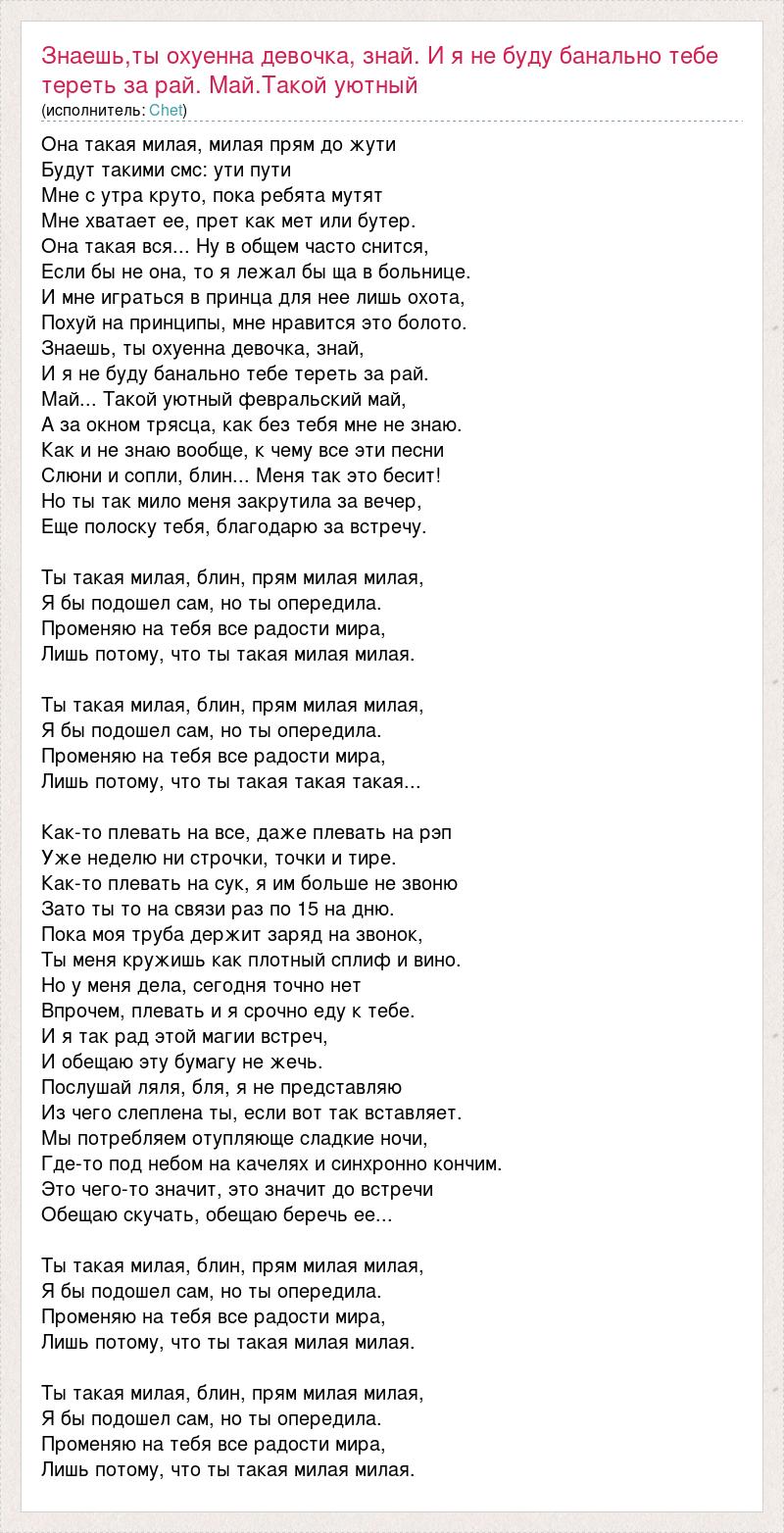 Она такая милая, милая прям до жути Будут такими смс: ути пути Мне с утра круто, пока ребята мутят Мне хватает ее, прет как мет или бутер. Она такая вся... Ну в общем часто снится, Если бы не она, то я лежал бы ща в больнице. И мне играться в принца для нее лишь охота, Похуй на принципы, мне нравится это болото. Знаешь, ты охуенна девочка, знай, И я не буду банально тебе тереть за рай. Май... Такой уютный февральский май, А за окном трясца, как без тебя мне не знаю. Как и не знаю вообще, к чему все эти песни Слюни и сопли, блин... Меня так это бесит! Но ты так мило меня закрутила за вечер, Еще полоску тебя, благодарю за встречу. Ты такая милая, блин, прям милая милая, Я бы подошел сам, но ты опередила. Променяю на тебя все радости мира, Лишь потому, что ты такая милая милая. Ты такая милая, блин, прям милая милая, Я бы подошел сам, но ты опередила. Променяю на тебя все радости мира, Лишь потому, что ты такая такая такая... Как-то плевать на все, даже плевать на рэп Уже неделю ни строчки, точки и тире. Как-то плевать на сук, я им больше не звоню Зато ты то на связи раз по 15 на дню. Пока моя труба держит заряд на звонок, Ты меня кружишь как плотный сплиф и вино. Но у меня дела, сегодня точно нет Впрочем, плевать и я срочно еду к тебе. И я так рад этой магии встреч, И обещаю эту бумагу не жечь. Послушай ляля, бля, я не представляю Из чего слеплена ты, если вот так вставляет. Мы потребляем отупляюще сладкие ночи, Где-то под небом на качелях и синхронно кончим. Это чего-то значит, это значит до встречи Обещаю скучать, обещаю беречь ее... Ты такая милая, блин, прям милая милая, Я бы подошел сам, но ты опередила. Променяю на тебя все радости мира, Лишь потому, что ты такая милая милая. Ты такая милая, блин, прям милая милая, Я бы подошел сам, но ты опередила. Променяю на тебя все радости мира, Лишь потому, что ты такая милая милая.